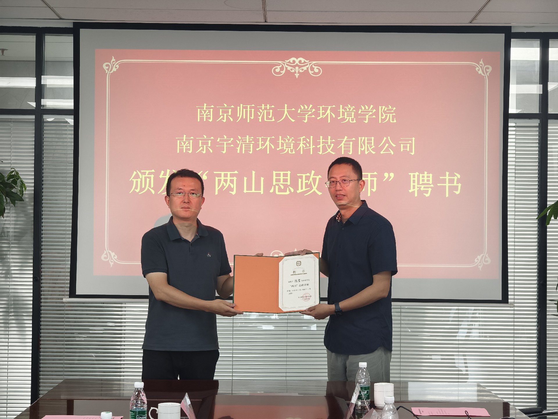 随后,双方举行了隆重的签约与授牌仪式。在双方代表的见证下,环境学院与3044永利集团正式签署“就业创业实践基地协议书”,副院长左晓俊向企业授予“产学研就业创业实践基地”铜牌,党委副书记李鹏向3044永利集团董事长陈雷颁发“‘两山’思政导师”。